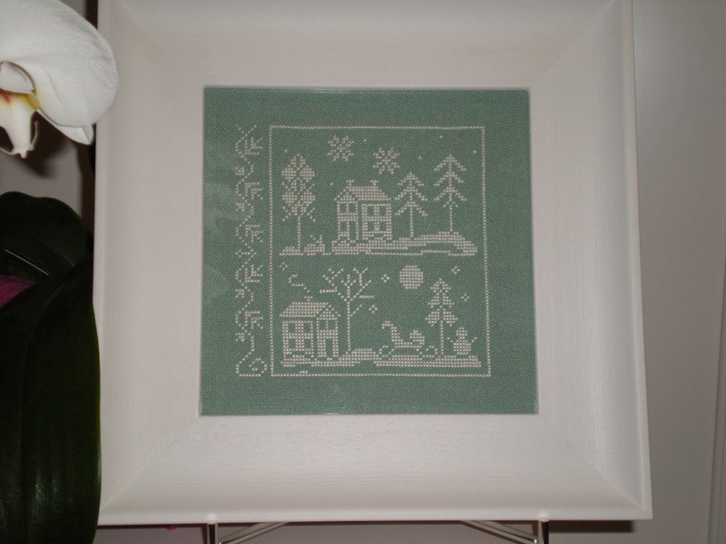 Se trata de un diseño de LHN, concretamente Snow White, Teresa y yo lo bordamos en seda de Gloriana blanca que sobre el fondo verde agua destacaba mucho ( esta seda tiene un brillo exquisito), quedó muy bien, no os parece ???.